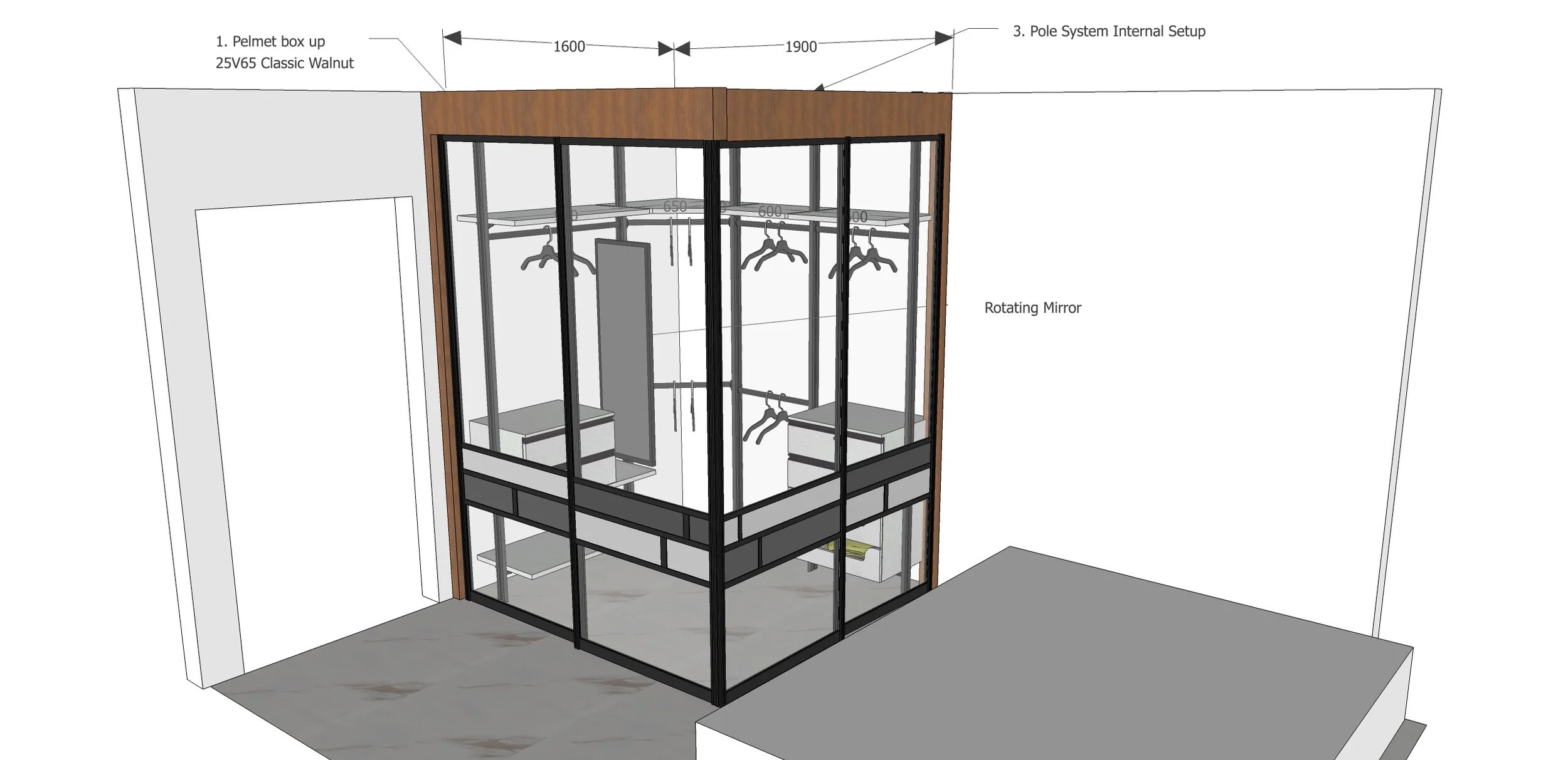 Hello guys, thank you for your interests in our pole system closet. Over here, we will walk you through the design and layout for our pole system closet. Typically before coming to our showroom, we will received enquires via email/watsapp from our clients. We will based on the dimension or floor plan and the requirement that is provided (i.e L shape, U shape, Straight pole system with or without door etc) and we will provide a layout with the quotation for reference.